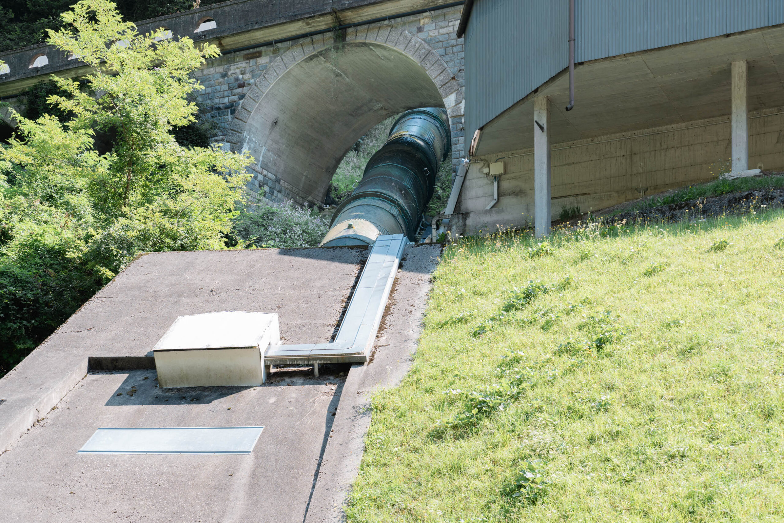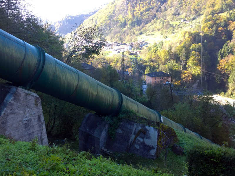 La galleria è collegata alla centrale con una condotta forzata metallica lunga 365 m, con diametro variabile da 2,00 a 2,6 m.